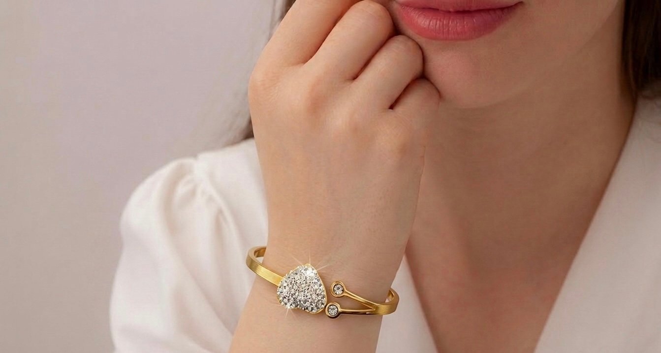 This item is a 316L anti tarnished gold-plated stainless steel cuff bracelet, typically featuring a heart-shaped charm studded with artificial stones.